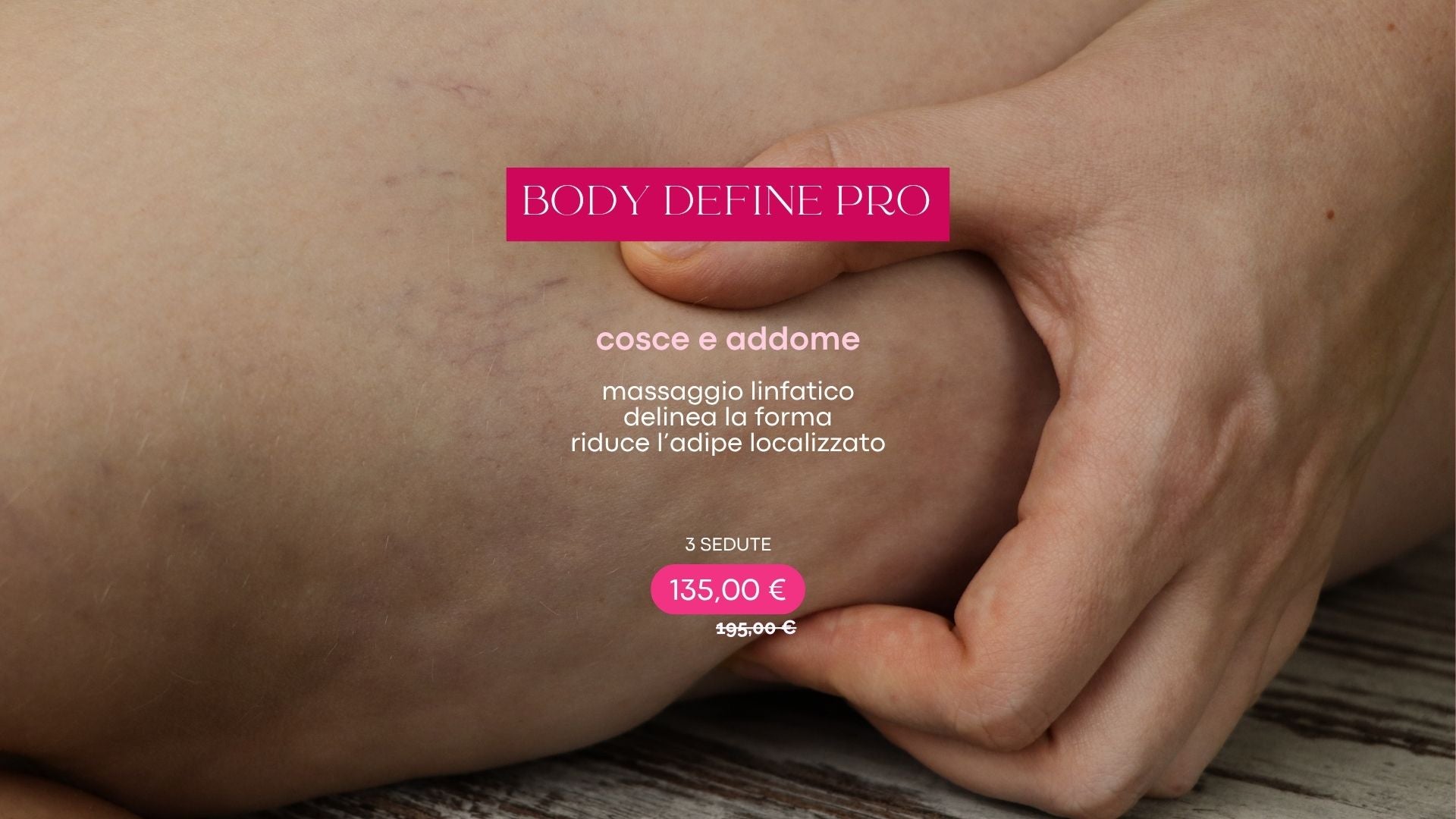Riduci visibilmente la buccia d’arancia e la ritenzione idrica grazie a massaggi drenanti, rimodellanti e detossinanti, combinati a tecniche come la maderoterapia e il nostro esclusivo Magic Touch, che stimolano il microcircolo e rendono la pelle più liscia e compatta.